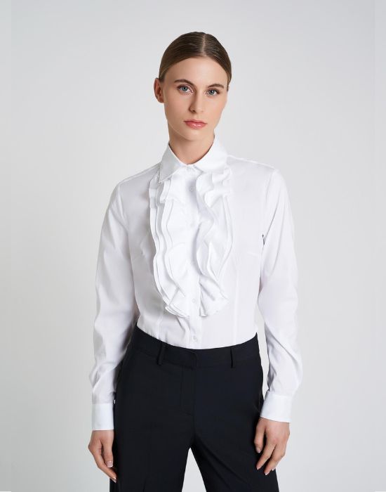Πλούσια βολάν στολίζουν κάθετα στο στήθος το πουκάμισο που κουμπώνει πάνω σε πατιλέτα.