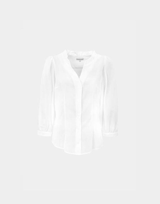 Elegant γυναικείο πουκάμισο σε ανάλαφρη βαμβακερή μουσελίνα. Σχεδιασμένο σε slim fit γραμμή,V decolette με λεπτά frills και τρουα καρ cuff μανίκια. Το κομψό πουκάμισο κουμπώνει μπροστά με λεπτά κουμπάκια.