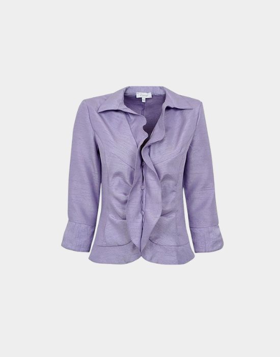 Created in a slim feminine silhouette with voluminous frills,stand up collar  and 3/4 cuffed sleeves.